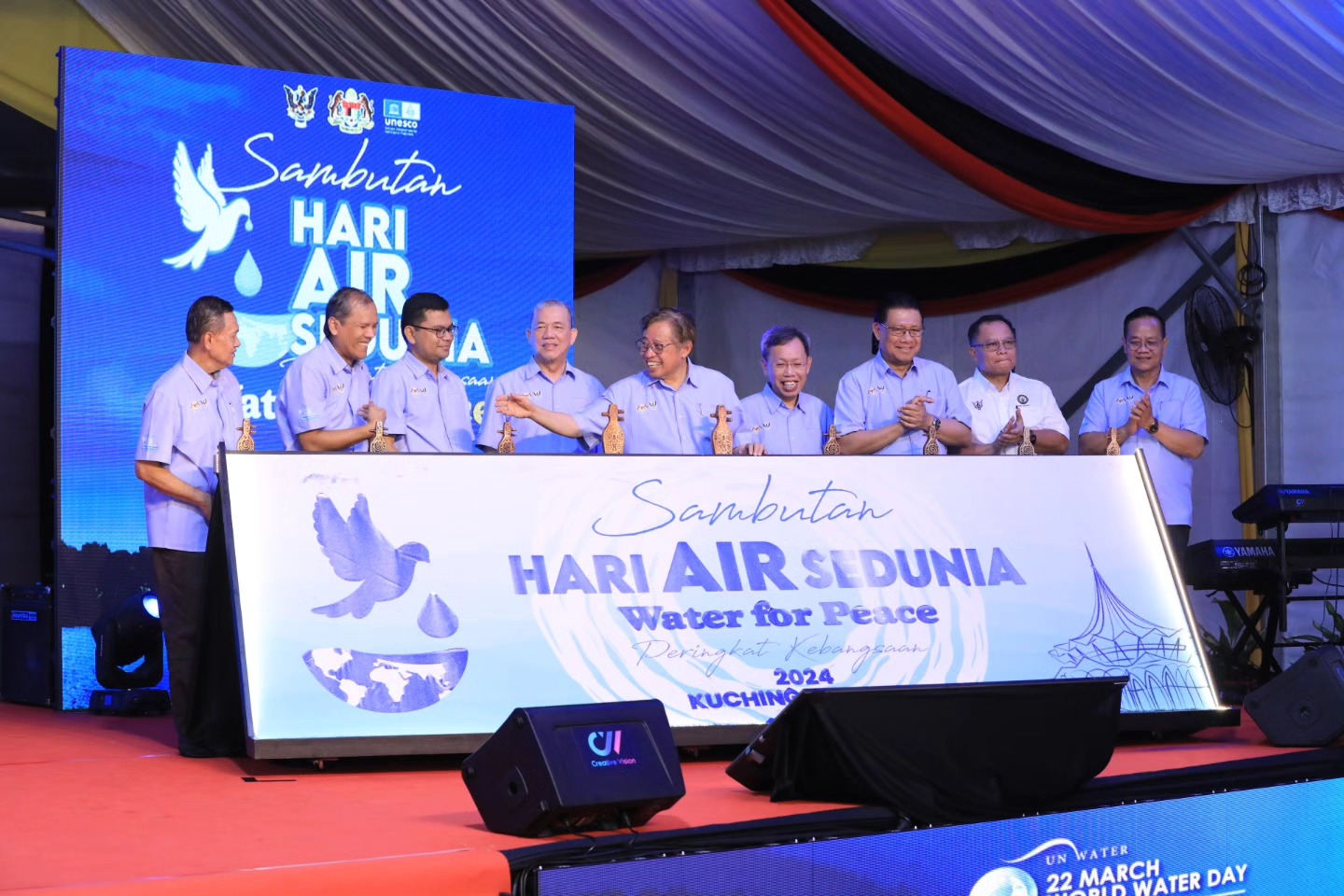 YAB TPM juga merakamkan setinggi-tinggi penghargaan dan ucapan terima kasih kepada YAB Premier Sarawak kerana sudi hadir untuk merasmikan Hari Air Sedunia 2024 ini dan kepada negeri Sarawak kerana telah menjadi Tuan Rumah bagi sambutan Hari Air Sedunia Peringkat Kebangsaan bagi Tahun 2024.